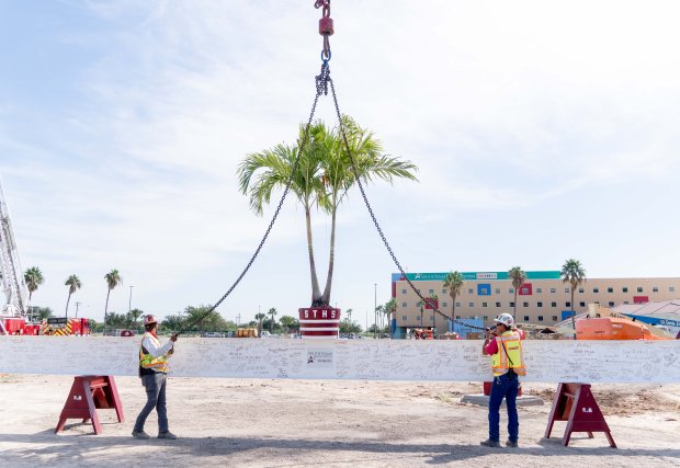 During a socially distanced ceremony held on Thursday, October 7, to celebrate the construction milestone, South Texas Health System Edinburg leaders and staff were joined by members of the construction team, as well as city officials, to witness the beam being raised to the topmost part of the tower. The beam, adorned with a palm tree, the American flag and an STHS flag, was signed by hospital employees, local physicians, the construction workers on the project and community members in the days leading up to the beam raising.